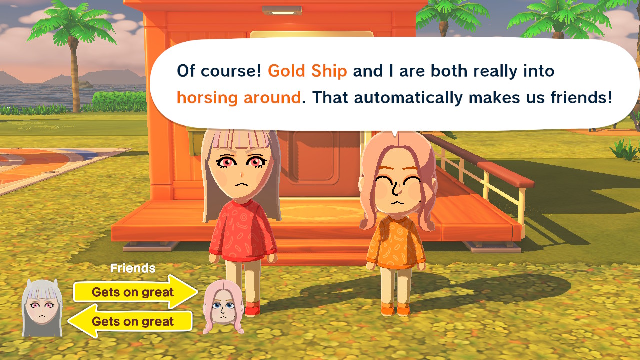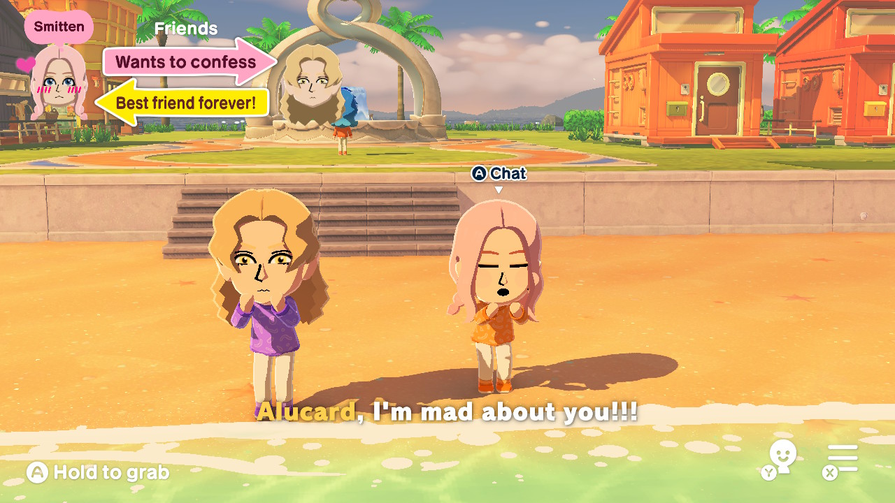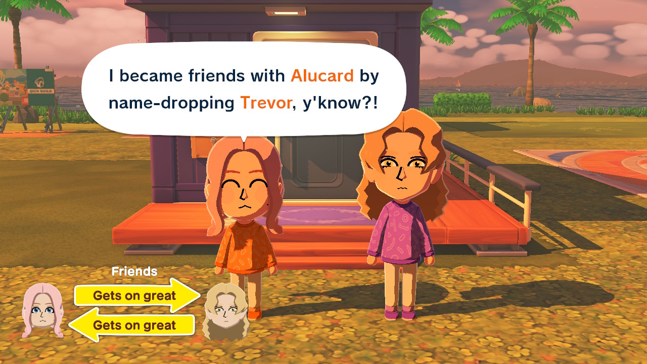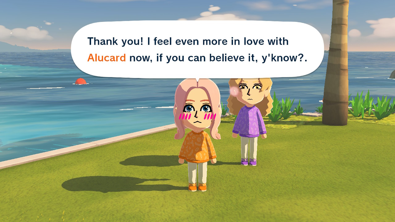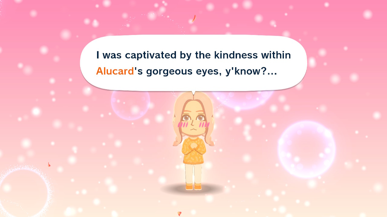 (Apologies if this is formatted weird, I typed this into my notes app on my phone and then copied and pasted it) So, I lied. It’s been a week and a bit since my last post and I did end up playing the demo, but I didn’t post like I said I would. I didn’t manage to do much in the demo, since of course I was limited to 3 miis and then they all ended up lobotomised. I restarted a few times to make some new miis, mostly myself and my irls, and I also made pim from smiling friends, Golshi from uma musume, Idia from twst, and Alucard from castlevania. I haven’t gotten the screenshots off of my sd card yet, so once I manage to get that sorted i’ll post a dump of some of my screenshots! In the meantime I’m a bit conflicted about the demo save files, my current save had my mii fall (literally) for Alucard, but I feel like I want to see it play out in a way that isn’t limited to just the demo has available, and for my mii to be unlimited in their choices (plenty of fish in the sea or whatever). I want to give all of them as much autonomy as possible, it’s more fun that way. I think I might just fully restart when the game comes out, since I don’t desperately need that hamster costume. I dunno. Also! I think I might turn this page into just a “games blog”, since I have more games on my PC that I think would be fun to write about *cough cough* ffxiv *cough*. That’s it for now, I think im just in the mood to yap so I’m stopping myself here while I can. Buhbye! -poopopoingmypants